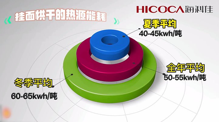 ◆ 智能節能型掛面干燥系統節能效果顯著,掛面烘干的熱源能耗為:夏季平均40-45kwh/噸,冬季平均60-65kwh/噸,全年平均約50-55kwh/噸。